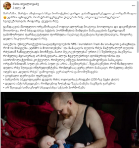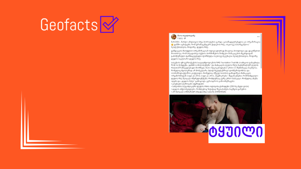 სოციალურ ქსელში Facebook-მომხმარებელი მაია თვალთვაძე, რომლის მიერ გავრცელებული დეზინფორმაცია (1, 2, 3, 4, 5) „ჯეოფაქტსს“ წარსულშიც გადაუმოწმებია, ფოტოს ავრცელებს (დაარქივებული ბმული) და ამტკიცებს, რომ მსოფლიო ჯანდაცვის ორგანიზაციის განცხადებით, ტრანსგენდერი ქალების რძე „ისეთივე სასარგებლოა“ ჩვილებისთვის, როგორც დედის რძე: „ჯანდაცვის მსოფლიო ორგანიზაციამ ოფიციალურად მიატოვა ბიოლოგია და დაჟინებით მოითხოვა, რომ სხვადასხვა სქესის ჰორმონების მიმღები მამაკაცების მკერდიდან გამოწურული ფარმაცევტული ფორმულა ისეთივე მკვებავია ჩვილებისთვის, როგორც დედის საკუთარი დედის რძე. სასექსის უნივერსიტეტის საავადმყოფოების NHS Foundation Trust-მა სიამაყით განაცხადა, რომ ის მიჰყვება „ჯანმო-ს მითითებებს“ და მამაკაცის დედის რძეს ნატურალურ დედის რძესთან ჩანაცვლებადს მიიჩნევს“, – წერს ანგარიში.