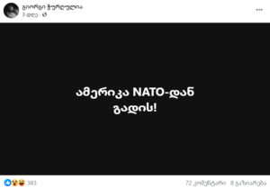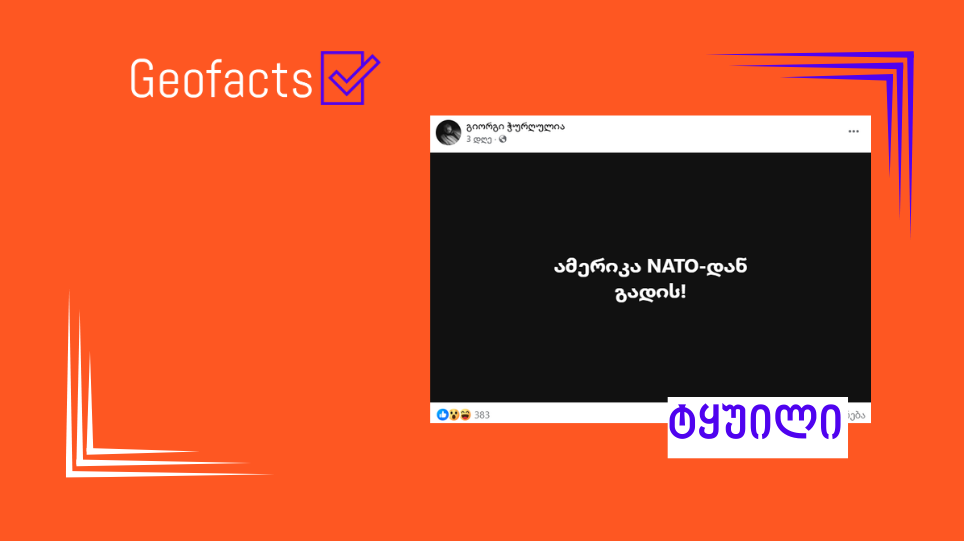სოციალურ ქსელში ვრცელდება მტკიცება, რომ „ამერიკა NATO-დან გადის!“ (დაარქივებული ბმული). სინამდვილეში, ამ ეტაპზე აშშ-ს მხრიდან ჩრდილოატლანტიკური ალიანსის დატოვების შესახებ ინფორმაცია არ გავრცელებულა. მსგავსი ინიციატივა, რომელიც შეერთებული შტატების ნატოდან გასვლას ითვალისწინებს, რესპუბლიკელმა თომას მესიმ კონგრესში წარადგინა, თუმცა ჯერჯერობით კანონპროექტი არ არის მიღებული და მას იურიდიული ძალა არ აქვს. ამავდროულად, აშშ-ის ეროვნული უსაფრთხოების ახალ სტრატეგიაში არაფერია ნათქვამი ალიანსის დაშლის ან აშშ-ის ალიანსიდან შესაძლო გასვლის შესახებ.