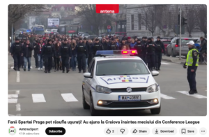 ოფიციალური გვერდის მიერ გავრცელებული ვიდეოს აღწერაში ვკითხულობთ: „სპარტა პრაღის“ გულშემატკივრებს შვებით შეუძლიათ ამოისუნთქონ — ისინი კონფერენს ლიგის მატჩამდე კრაიოვაში ჩავიდნენ“ (Fanii Spartei Praga pot răsufla uşuraţi! Au ajuns la Craiova înaintea meciului din Conference League).