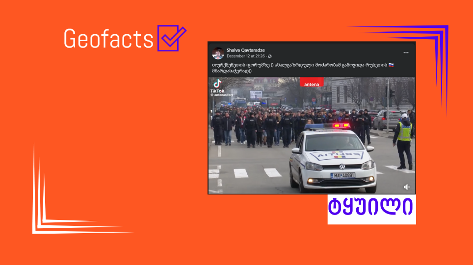 ამგვარად, მტკიცება, რომლის თანახმადაც ვიდეო თურქმენეთშია გადაღებული, სადაც რუსეთის მხარდასაჭერი აქცია გაიმართა, ტყუილია. რეალურად, ის რუმინეთშია გადაღებული და ფეხბურთის ფანების მარშს ასახავს.