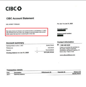 ვიდეოში აგრეთვე ნაჩვენებია დოკუმენტი, რომელიც, ვიდეოს თანახმად, ანდრიი ერმაკის საბანკო გადარიცხვების ჩანაწერს წარმოადგენს. პოსტის მიხედვით, ჩანაწერი ოფშორულ ზონებში ბანკების CIBC Carribean სა და Nevis International-ის გამოყენებით 2.6 მილიარდი დოლარის გზავნილებს აჩვენებს. დოკუმენტზე ჩანს CIBC-ის ლოგო. ფოტოს ძიების ინსტრუმენტის თანახმად, იდენტური დოკუმენტი Scribd-ის ვებგვერდზე იძებნება, სადაც მხოლოდ ერმაკის სახელი და ციფრებია შეცვლილი, შესავალი ტექსტი და თარიღი (17 თებერვალი) ორივე დოკუმენტში იდენტურია.