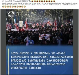 სოციალურ ქსელში Facebook-ანგარიში  ქარდს აქვეყნებს, რომელზეც ვკითხულობთ: „ალტ-ინფომ 7 დეკემბერს 20 ათასი ხელოვნური ინტელექტი გენერირებული მოქალაქე გამოიყვანა უპრეცედენტო არაბული ინვესტიციის წინააღმდეგ მოწყობილ აქციაში“.  ფოტოს მარცხენა ზედა კუთხეში ტელეკომპანია „იმედის“ ლოგო ჩანს, რაც  მომხმარებლებს აფიქრებინებს, თითქოს ინფორმაციის გამავრცელებელი სწორედ ეს მედიასაშუალებაა (დაარქივებული ბმული).