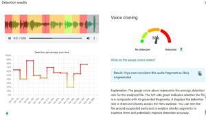 „ჯეოფაქტსმა“ ჩანაწერი ხელოვნური ინტელექტის ამომცნობი ხელსაწყოებით გადაამოწმა. InVID & WeVerify-ის ხელსაწყოში ჩაშენებული აუდიო დეტექტორის Hiya-ს დახმარებით მიღებული შედეგების მიხედვით, აუდიო ჩანაწერი 58%-ით ხელოვნური ინტელექტის მიერ არის შექმნილი. ხელსაწყო აუდიო მასალას 3-წამიან მონაკვეთებად ჰყოფს და ცალ-ცალკე აანალიზებს, 58% კი მთლიანი ჩანაწერის საშუალო მაჩვენებელია. მაგალითად, ჩანაწერის მონაკვეთი 9 წამიდან 12 წამამდე 90%-ით ხელოვნური ინტელექტის მიერ არის შექმნილი, ხოლო მონაკვეთი 30-დან 36 წამამდე – 20%.