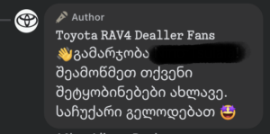 სოციალურ ქსელში ვრცელდება პოსტი, რომელზეც „ტოიოტას“ ფირმის ავტომობილი ჩანს და ქვემოთ რამდენიმე ციფრი. აღწერა შემდეგია: „ჯერჯერობით ვერავინ იპოვა 604-ის გარდა სხვა ნომერი; შესაბამისად, 2026 წლის Toyota RAV4-ის გამარჯვებული არ არსებობს. მხოლოდ ორი გამარჯვებული დარჩა.” რეალურად პოსტი „ტოიოტას“ წარმომადგენლებს არ ეკუთვნით და ის სავარაუდოდ თაღლითური სქემის ნაწილია. (არქივირებული ბმული)