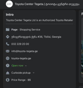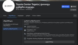 მეორე გვერდი, სადაც „ტოიოტა“ ფიგურირებს, “Toyota Center Tegeta/ტოიოტა ცენტრი თეგეტაა“, რომელიც ასევე ბრენდის ოფიციალურ დილერს წარმოადგენს. აღნიშნული Facebook-გვერდი 2013 წლის 8 ნოემბერსაა შექმნილი და 2026 წლის 19 იანვრის მონაცემით 89 ათასი გამომწერი ჰყავს. გვერდსაც დეტალურად აქვს მითითებული საკონტაქტო ინფორმაცია – ვებგვერდი, ტელეფონის ნომერი, მისამართი და სხვა. ეს გვერდიც, პირველის მსგავსად, ავტომობილებთან და კომპანიის სერვისებთან დაკავშირებულ სხვადასხვა შინაარსის სიახლეს ხშირად აქვეყნებს. თუმცა მანქანის გათამაშებასთან დაკავშირებით „ “-ის მსგავსი პოსტი არ ერთ ოფიციალურ გვერდს არ გამოუქვეყნებია.