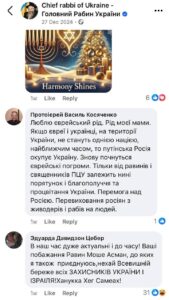 რაბინის პოსტი უკრაინის ეროვნული გვარდიის მეთაურთან ერთად ჰანუქას მენორის დანთებას შეეხებოდა. კოსიაჩენკომ კი მის ქვემოთ ასეთი კომენტარი დაწერა:
