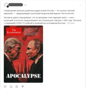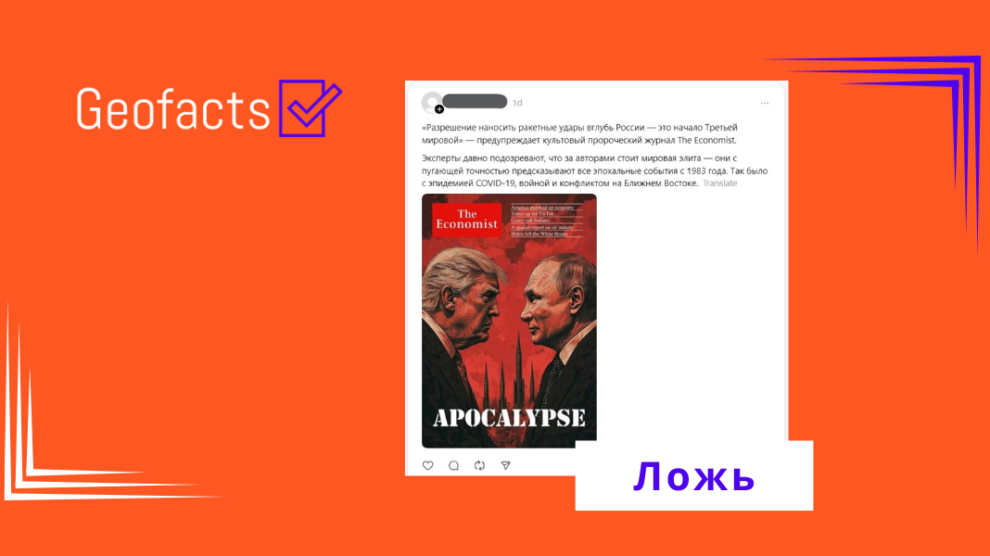 На прокремлевских страницах в социальных сетях распространяется информация о том, что всемирно известный журнал «Экономист» разместил на своей обложке картинку с изображением Путина и Трампа, с заголовком «Апокалипсис», а также опубликовал статью, в которой утверждается, что разрешение наносить ракетные удары по территории России – это начало Третьей мировой». (1; 2; 3)