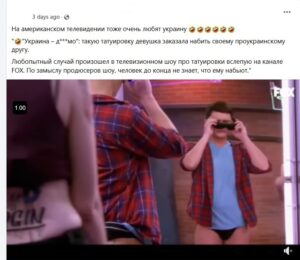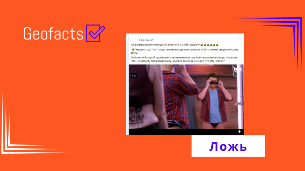 «На FOX в шоу про смешные татуировки вслепую – человек до конца не знает, что ему набьют. Женщина заказала набить своему другу татуировку «Украина – дерьмо». На обосранной туалетной бумаге написано – «Украина дерьмо». Реакция жертвы бесценна» – говорится в сообщении.