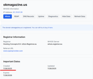 По данным открытой базы данных по регистрации доменов Whois, сайт okmagazine.us был зарегистрирован 28 июля 2025 года, фальшивая статья о президенте Молдовы была размещена 30 июля, соответственно, сайт появился на свет за 2 дня до публикации.