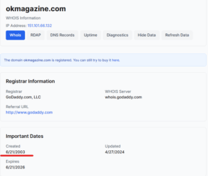 Реальный сайт реального журнала okmagazine.com был зарегистрирован 21 июня 2003 года.