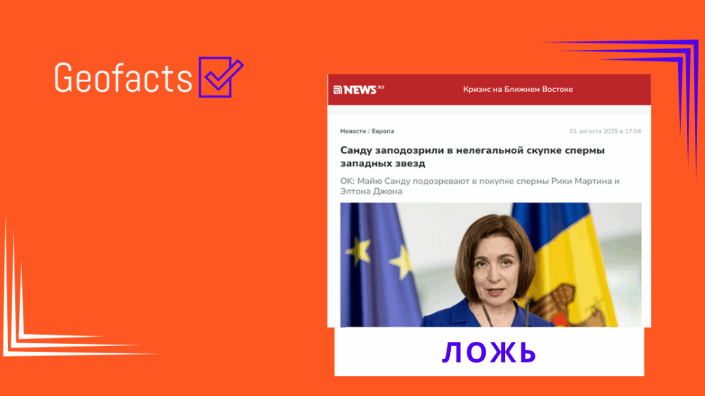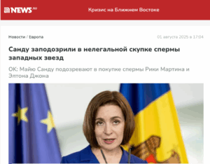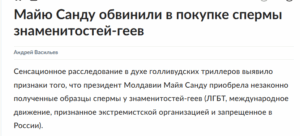 На прокремлевских страницах в социальных сетях (1; 2; 3) и в соответствующих СМИ (Российская газета, Царьград, news.ru) распространяется утверждение, согласно которому президент Молдовы Майя Санду незаконно приобрела сперму, полученную от знаменитостей-геев.