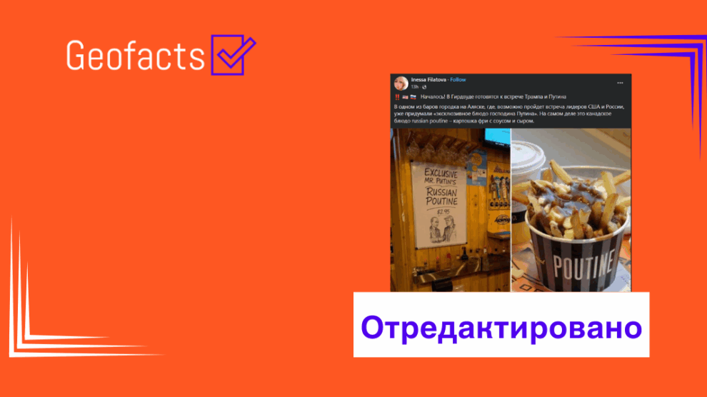 На прокремлевских страницах в социальных сетях распространяется утверждение, согласно которому в городе Гирвуд на Аляске, где возможно было проведение встречи Путина и Трампа, в одном из баров появилось новое блюдо – картофель фри «Путин». (1; 2; 3)