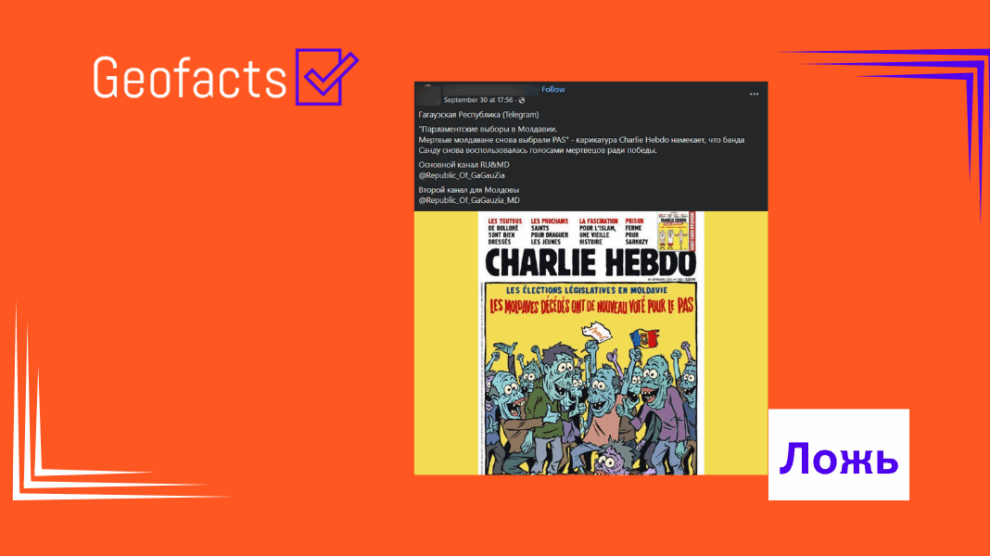 На прокремлевских страницах в социальных сетях распространяется утверждение, согласно которому на обложке французского сатирического журнала «Шарли Эбдо» опубликована карикатура, посвященная недавним парламентским выборам в Молдове.
