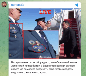 В попытке разрядить обстановку его «приветствовала» собственная команда, включая пилота его самолета». Фото также распространил российский пропагандист Владимир Соловьёв.