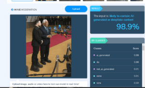 Согласно выводам системы распознавания ИИ Undetectable.ai, фотография содержит след ИИ с вероятностью 97%. Согласно другому инструменту, Hive Moderation, фотография изменена искусственным интеллектом или Deepfake с вероятностью 98,9%.