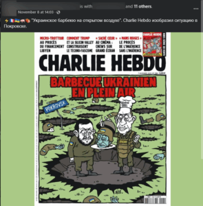 В качестве доказательства представлен скрин, на котором изображено нечто, похожее на обложку журнала. В карикатуре показан Владимир Зеленский, держащий в руке поднос с головой украинского солдата, над картинкой написано «Украинское барбекю на свежем воздухе» – по утверждению авторов поста, французский журнал таким образом реагирует на события в Покровске. (Архив)