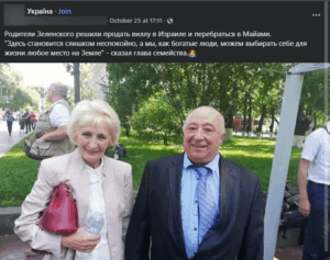 В российском сегменте социальных сетей распространяется утверждение о том, что якобы родители президента Украины Владимира Зеленского намерены продать виллу в Израиле, и переехать жить в Майами, так как в Израиле сейчас неспокойно, и все, кто может пытаются его покинуть. (1; 2; Архив)