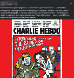 «Расхитительница гробниц приехала к расхитителю европейской казны — Charlie Hebdo. Французские карикатуристы изобразили приезд голливудской актрисы, Анжелины Джоли, сыгравшей Лару Крофт, на Украину. Обратите внимание на второй план — там ТЦКшники уводят ее водителя, как и было на самом деле. Рядом с Зеленским — череп в каске ВСУ, как символ огромных потерь украинского народа» – говорится в утверждении. (1; 2; Архивная ссылка)