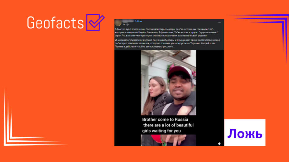 Индиец прогуливается с русской по улицам Москвы и приглашает своих соотечественников побыстрее заменить ванюшек, которые толпами утилизируются в Украине. Хитрый план Путина в действии.» — говорится в комменте, сопровождающем картинку.